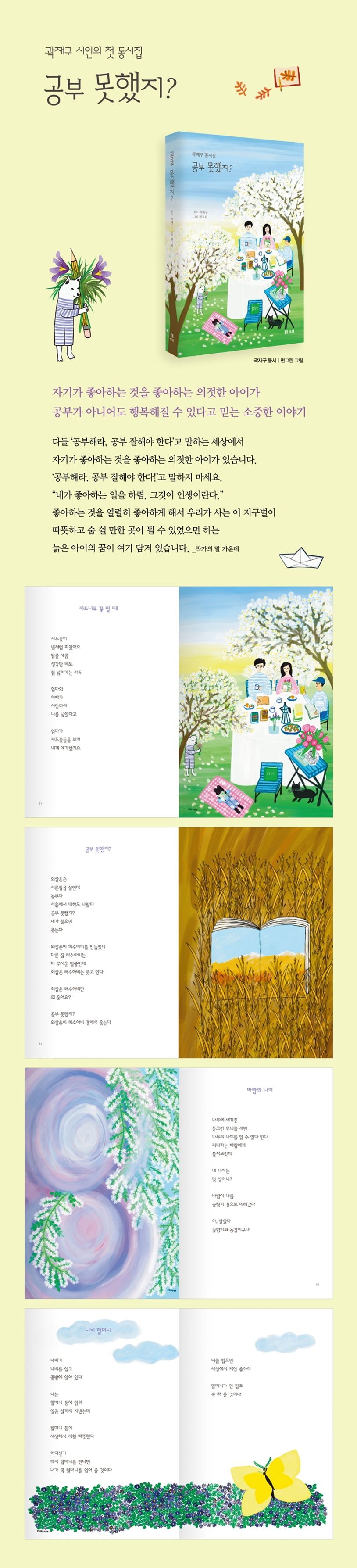 《공부 못했지?》는 곽재구 시인이 등단 이후 처음으로 펴내는 동시집입니다. 날마다 하루도 빠짐없이 시를 쓰는 곽재구 시인이 아이의 마음으로 세상을 바라본 시 61편이 담겨 있습니다. 자연과 생명에 대한 사랑이 가득한 아이는 좋아하는 것이 참 많습니다. 하지만 단 하나, 공부는 싫어합니다. 그러나 아이가 좋아하는 것을 열렬히 좋아하고, 잘하는 것을 계속 더 잘해 나간다면 공부가 아니어도 얼마든지 행복한 삶을 살 수 있다는 소중한 메시지를 담았습니다. 곽재구 시인이 포착해 낸 시의 세상이 일러스트레이터 펀그린 작가의 붓끝에서 자유롭고 아름다운 그림으로 재탄생했습니다.