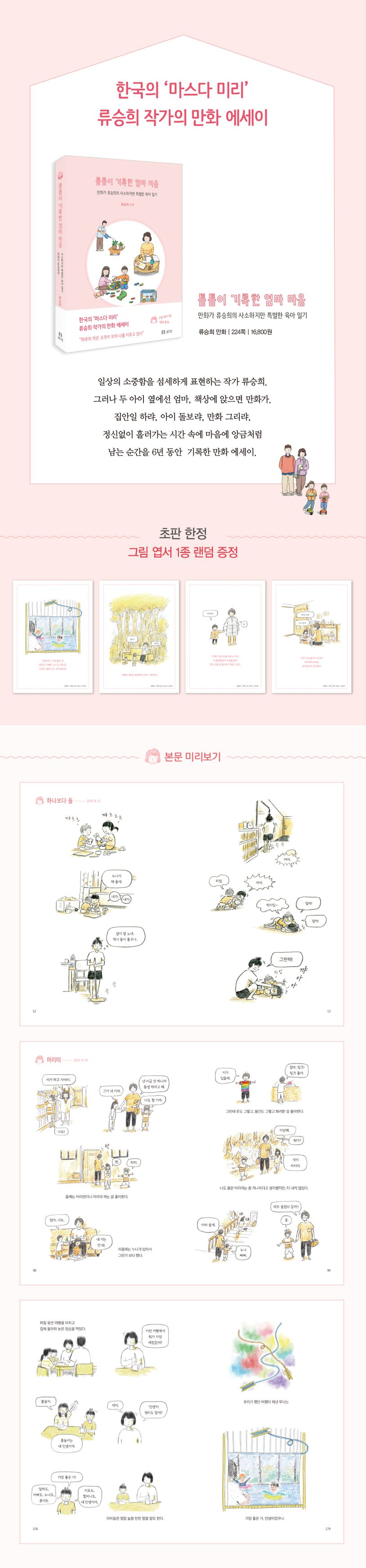 보리 만화밥 14번째 권으로, 일상의 소중함을 섬세하게 표현하는 작가 류승희의 첫 그림 에세이 책 《틈틈이 기록한 엄마 마음》이 출간됐다. 류승희 작가는 두 아이 옆에선 엄마이자, 책상 앞에선 만화가로, 집안일 하랴, 아이 돌보랴, 만화 그리랴 바쁜 가운데서도 아이들과 지내면서 마음에 앙금처럼 남는 순간을 붙잡아 틈틈이 그림일기로 기록했다. 이 책은 일상에서 마주치는 사소한 순간을 솔직하면서도 담백하게 포착해 그려낸 그림 에세이로, 48편의 이야기 속에는 두 아이의 성장과 함께 초보 엄마도 함께 성장하는 순간들이 담겨 있다. 육아를 하는 모든 부모들에게 아이와 기쁘고 즐겁게, 힘들고 어렵게 지내는 시간들이 결코 힘든 순간만은 아니라는 다정한 위로를 전한다.