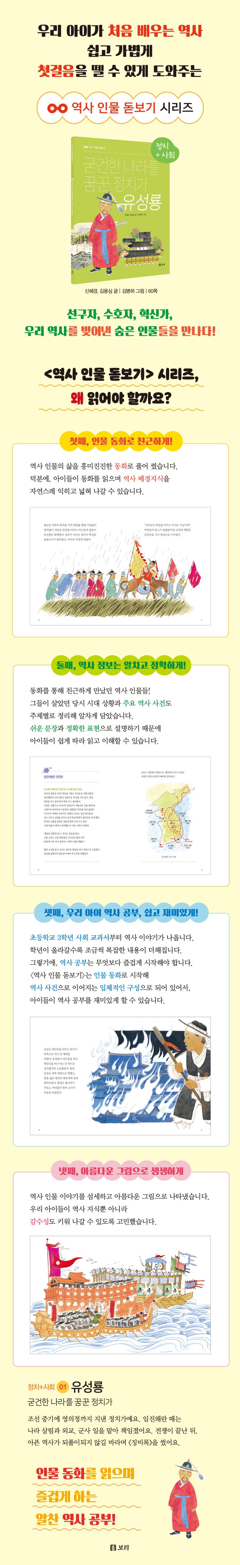 우리 역사를 빚어낸 숨은 역사 인물들을 만나는 〈역사 인물 돋보기: 정치+사회〉 시리즈입니다. 흥미진진한 인물 동화로 어린이들이 역사 공부를 시작할 때 쉽고 가볍게 첫걸음을 뗄 수 있게 도와줍니다. 시리즈 첫 번째 책에서는 우리나라의 정치 제도와 사회를 만들어 간 인물 가운데 조선의 국무총리라고 할 수 있는 영의정을 지낸 유성룡을 소개합니다. 유성룡은 임진왜란 7년 동안 나라 살림과 외교, 군사 일을 맡아 책임졌습니다. 이순신 장군을 전라도 수군절제사로 추천하기도 한 유성룡은 훗날 아픈 역사를 되풀이하지 않길 바라며 《징비록》을 썼습니다. 백성의 삶에 도움이 되는 정치를 펼치려 했던 유성룡의 이야기를 만나 보세요.