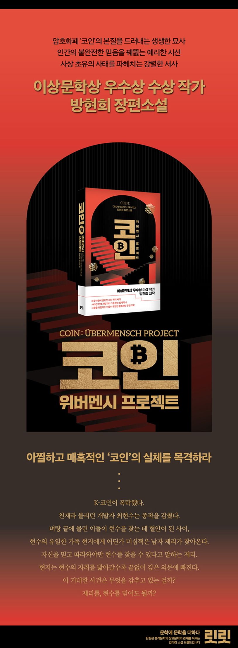 제42회 이상문학상 우수상을 수상하며 삶의 이면을 투시하는 시선을 끝없이 벼려내고 있음을 증명한 방현희 작가의 신작 『코인: 위버멘시 프로젝트』가 출간됐다. 그가 이번에 투시한 대상은 암호화폐 ‘코인’이다. 황홀한 급등과 무자비한 급락을 반복해온 코인의 속성을 남다른 시선으로 파헤쳐 강렬하면서도 우아한 이야기를 만들어냈다. 순식간에 폭락한 코인과 사라진 천재 개발자, 그의 행적을 추적하며 사태의 본질을 마주하는 코인 유튜버와 발레리나의 이야기가 독자들을 아찔한 코인의 세계로 초대한다.
