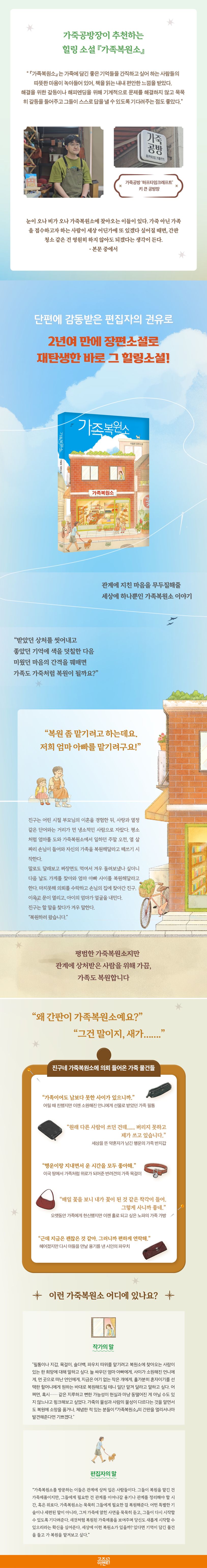 독자들에게 많은 사랑을 받은 『이달의 장르소설』 창간호 선정작 단편 힐링소설 「가족복원소」가 장편소설로 개작되어 출간됐다. 『가족복원소』는 평범한 가죽복원소에 어느 날 자신의 가족을 복원해달라는 ‘둘이’가 방문하며 벌어지는 이야기를 장편소설로 개작한 것으로, 이후 여러 손님으로부터 사연이 담긴 가죽제품을 맡아 복원하는 이야기를 담고 있다. 가죽제품에 담긴 여러 가족관계에 관한 이야기들이 하나둘, 복원되어 가는 과정이 관계에 지친 사람들에게 새로운 출발을 위한 위로와 용기를 전한다.