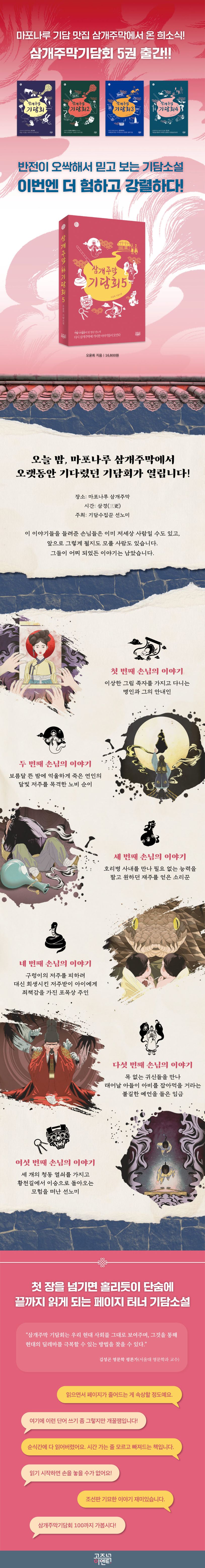 마포나루의기담맛집삼개주막을아시나요?“삼개주막은한양도성에서서남쪽으로십리쯤떨어진마포나루어귀에있었다.”매권마다이렇게시작하는삼개주막기담회의프롤로그는이제독자들의심박수를순식간에끌어올리는버튼이되었다.첫문장을읽자마자벌써두근거리는효과가일어난다.조선시대엔마포나루를삼개나루라고도불렀는데,삼개주막의이름도그런지명에서연유한것이다.삼개주막은기담을모으는기담수집꾼선노미와그의여동생이자주모인복이가주인이다.『삼개주막기담회5』는비교적정확한시간적인배경을가지고있는데,정조즉위11년인1787년으로추정된다.이야기는선노미가일년동안의방황을마치고집으로들어온지7년뒤를다루고있다.소년에서청년으로성장한선노미는주모가된복이와함께어머니가물려준삼개주막을꾸려가며,들고나는손님들에게기이한이야기를들을때마다하룻밤공짜로묵어가게해준다.그렇게듣게되는이야기들이삼개주막기담회에담겨서나온다.벌써5권째라고?독자들의식지않는삼개주막방문기삼개주막기담회는반전이더오싹하다는독자반응이줄을이으면서믿고보는역사기담소설로자리잡아,2021년12월마지막날첫권이출간된이래어느새5권까지나왔다.5권은삼개주막기담회가이제나저제나다시열리길기다리는독자성원에힘입어2년만에출간되었는데,독자들에게보답하기위해작가도에피소드마다반전에더욱심혈을기울였다고한다.삼개주막기담회가이렇게독자들의인기를꾸준히모으는비결은무엇일까?창작역사기담소설로손에꼽는작품이기도하지만,그보다는끝까지긴장을놓을수없게만드는작가특유의소설전개방식이더큰한몫을하고있다.이야기가이제일단락되었다고안도하는순간,그모든사실이뒤집어지거나,생각지도못한진실을깨달을때의충격은공포그이상이다.그래서마지막한줄이다끝날때까지느슨함없이쫄깃쫄깃한기분을유지할수있고,무심코책을잡았다가어느새마지막페이지를덮고있는걸발견하고소스라치게놀랐다는독자들의경험담이이어졌다.반전이오싹한기담소설,이번엔더험한것들이온다!매권의이야기소재는앞표지의일러스트에서어느정도힌트를얻을수있다.5권에는미인이그려진그림족자,소원을들어주는호리병,보름달원혼,저주를품은구렁이,열리지않는청동열쇠등이다.일러스트를통해이야기를유추해보는것도삼개주막기담회만의재미다.족자속에그려진여인은사람들을유혹해그림속에가두는마력을가지고있다.가장나중에그림에갇히는자는생각지도못한인물이다.보름달이뜰때마다나타나는원혼은사랑에빠진연인을운명의함정에빠트리는데,실은어디에도함정은존재하지않았다.재능이없어절망한소리꾼은호리병사내에게가장쓸모없는걸팔고그토록원하던재주를산다.그러나팔아버린가장쓸모없는것이실은가장필요했다는걸깨닫는다.구렁이를죽여원한을산부부는태어날아기대신저주를받을남의아기를사서함께키운다.구렁이의저주로결국저주받이아이에게화가미치지만,가장끔찍한저주는따로있었다.궁궐에불려간선노미는목잘린귀신들이꿈에나타나는임금의고충을듣고그연유를풀어보지만,목잘린귀신보다무서운진실은가장가까운데있었다.생사를헤매던선노미가세개의청동열쇠로다시이승으로돌아오는여정은감동적이지만,생각지도못한불행이멀리서삼개주막을노려보고있다는건아무도몰랐다.이렇게6편의간담서늘하게해줄기담이봄날독자의싱숭생숭한밤을찾아간다.