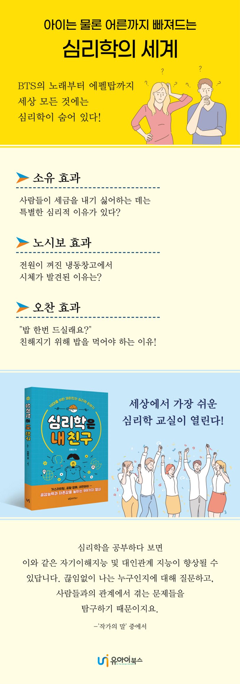 ‘열 길 물속은 알아도 한 길 사람 속은 모른다’라는 속담이 있습니다. 사람의 속마음을 알기란 매우 힘듦을 비유적으로 나타내는 말입니다. 마음은 눈에 보이지 않기에 더욱 어렵게 느껴지지요. 하지만 스스로를 알고, 타인과 건강한 관계를 유지하기 위해서는 반드시 마음의 비밀을 풀어야 합니다. 그렇다면 마음의 비밀은 어떻게 풀 수 있을까요? 상담심리 전문가이자 현직 교사인 저자는 다양한 심리 법칙이 중요한 열쇠가 되어줄 것이라고 이야기합니다. 《심리학은 내 친구》에는 99가지의 심리학 개념이 담겨 있습니다. ‘머피의 법칙’처럼 친근한 개념은 물론, ‘삶은 개구리 증후군’처럼 생소한 개념도 누구나 쉽게 이해할 수 있도록 풀어내고 있지요. 지금부터 우리의 뇌 속에, 사람과 사람 사이에, 커다란 세상 속에 숨어 있는 심리 법칙을 즐겁게 배워 볼까요?