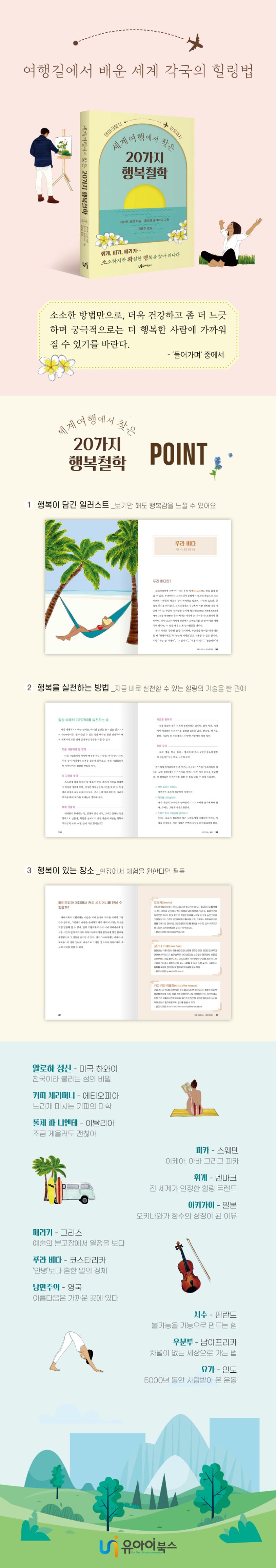 행복은 과연 어디에 있을까? 《세계여행에서 찾은 20가지 행복철학》은 세계 곳곳에 존재하는 여러 가지 ‘행복 찾기’ 방법을 제시한다. 거창한 노력이나 근본적인 변화를 필요로 하는 방법은 아니다. 그저 여행 프로그램을 보듯 저자의 발자국을 따라가다, 마음에 드는 개념이 있다면 일상의 귀퉁이에 조금만 틈을 내면 된다. 그러면 동네 산책로가 어느새 노르웨이에서 트래킹 코스로 바뀌고, 간단히 만든 집밥에서 이탈리아의 미식을 느낄 수 있을 것이다.
