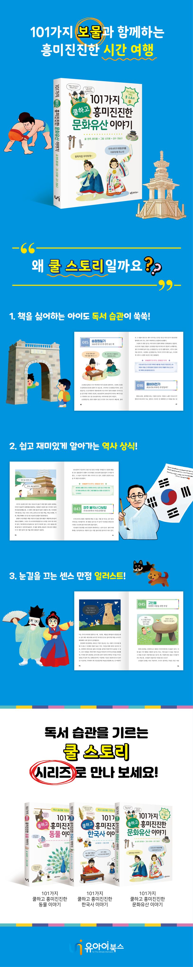 우리나라는 흔히 5000년의 방대한 역사를 가진 나라로 소개됩니다. 이처럼 오랜 시간 동안 한반도를 지킨 선조들은 우리에게 수많은 문화유산도 남겨 주었지요. 그중에는 국경을 넘어 세계의 보물로 인정받은 것들도 있답니다. 《101가지 쿨하고 흥미진진한 문화유산 이야기》에서는 국보뿐 아니라 유네스코가 지정한 우리의 문화유산, 전통 춤이나 풍속과 같은 무형문화재까지 다채로운 문화유산을 쉽고 재미있게 만나볼 수 있습니다.《101가지 쿨하고 흥미진진한 문화유산 이야기》를 읽다 보면 책과 친하지 않은 아이라도 어느새 독서 습관이 쑥쑥 자라날 거예요.