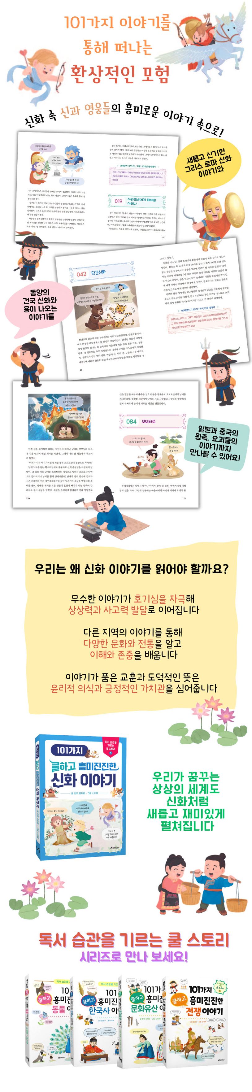 신화는 역사와 문화, 예술 분야까지 우리의 생활 속에 깊게 자리하고 있습니다. 전 세계적으로 알려진 정보이자, 모든 이야기의 시작이기 때문이지요. 이렇게 여러 분야와 관련이 깊은 신화를 알아둔다면 학습이 더 흥미롭고 유익해지지 않을까요? 《101가지 쿨하고 흥미진진한 신화 이야기》는 대중적인 그리스 로마 신화에 이어 우리의 한국 신화와 쉽게 접하기 어려운 일본, 중국의 신화까지 무려 101가지의 모험을 다룬답니다. 익숙했던 그리스 로마 신화에 대해서는 더 자세하게 알게 되고, 새로운 동양 신화 또한 무척 흥미롭게 느끼게 되는 시간입니다. 다채로운 색을 가진 신화 이야기를 읽다 보면 우리의 상상력 또한 아름답게 물들기 시작할 거예요.