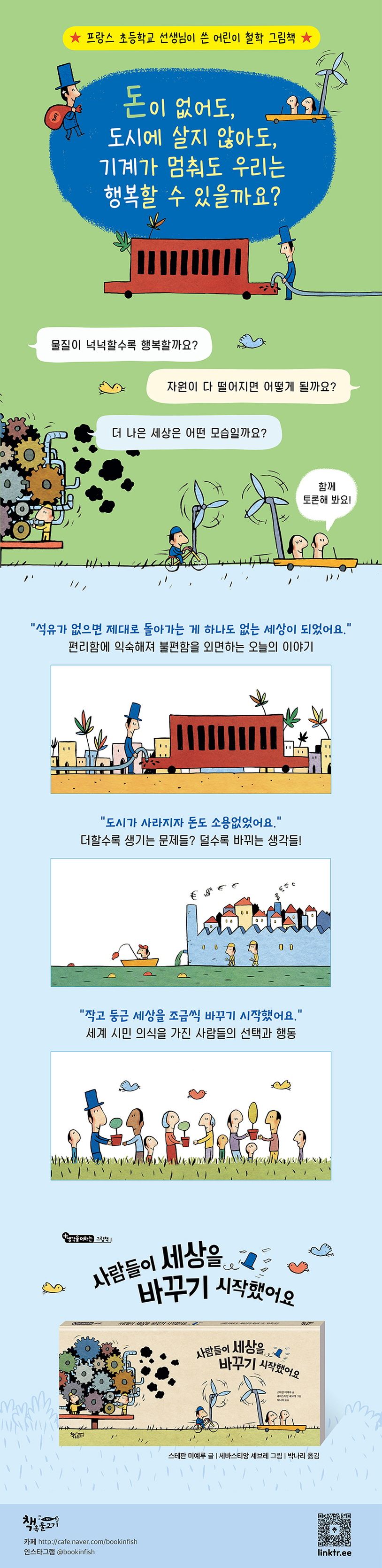 『사람들이 세상을 바꾸기 시작했어요』는 사람들의 선택에 따라 삶과 생각이 어떻게 변화하는지 보여 주는 어린이 철학 그림책입니다. 이 이야기는 프랑스 초등학교 선생님이 아이들과 함께 현대 사회의 문제에 대해 다양한 생각을 나누려고 썼어요. 우리는 물질만능주의 사회를 살아가고 있어요. 돈만 있으면 무엇이든 마음대로 할 수 있다고 생각하고, 서로 기회를 차지하려고 큰 도시에 모여들고, 더 편리하게 생활하려고 기계가 쉴 새 없이 돌아가고 있지요. 그렇다면 과연 물질이 넉넉할수록 행복할까요? 만약 모든 것이 멈춘다면 어떻게 될까요? 더 나은 세상은 어떤 모습일까요? 이 그림책은 아이들이 인문학적인 질문들을 끊임없이 던지고 비판적으로 다루면서 토론하길 바라요.