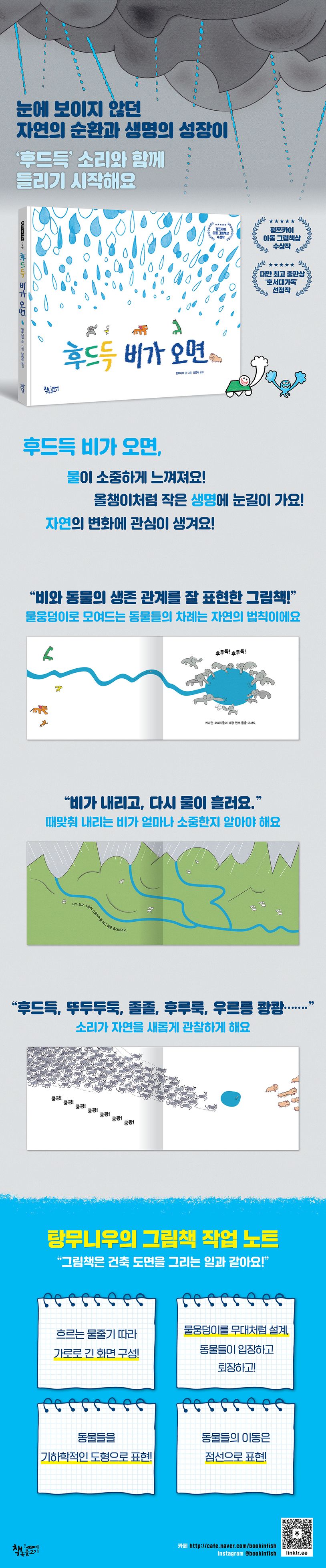 지은이 탕무니우는 자연과 예술을 사랑해요. 그리고 아이들의 마음을 잘 아는 그림책 작가예요. 이번에는 자연은 자연스러울 때 아름답고, 끊임없이 흐르고 흘러 모든 생명을 성장하게 하는 물의 가치를 아이들의 감정과 생각을 바탕으로 이야기를 만들었어요. 바로 『후드득 비가 오면』이에요! 이 그림책은 자연스럽게 돌아가는 자연의 이야기를 담고 있어요. 비가 내리고 흘러가는 여정을 따라 물을 마시며 살아가는 동물들을 보여 주면서, 자연의 순환과 생명의 성장을 단순하지만 깊이 있게 표현했지요. 그림책을 읽고 나면 아이들은 물을 소중히 여기고, 올챙이처럼 작은 생명에도 눈길을 주고, 자연의 변화에 관심을 가지게 될 거예요.