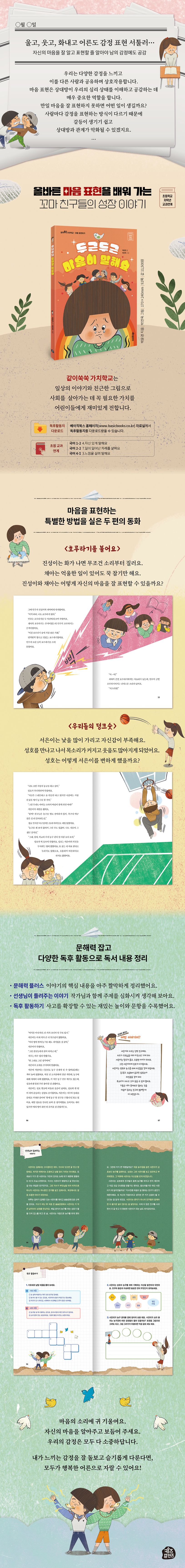 같이 쑥쑥 가치학교 두 번째 이야기 《두근두근 마음이 말해요》는 자기의 마음이 어떤 색깔을 가지고 있는지 똑바로 들여다보고, 올바르게 표현하는 방법을 알려 주는 동화예요. 마음을 제대로 표현할 줄 알면 어떻게 될까요? 다른 사람과의 소통이 원활해지고, 친구들과 좋은 관계를 만들 수 있어요. 공감 능력도 높아져 친구가 기쁠 때는 같이 기뻐하고 친구가 속상해할 때는 위로의 말을 건넬 수도 있지요.