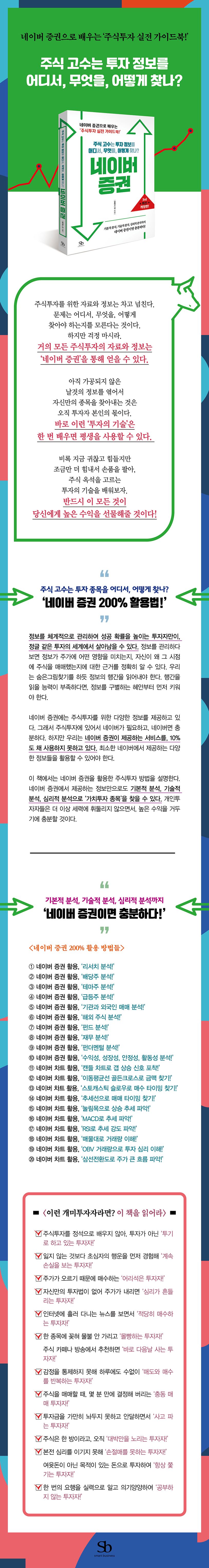 이 책에서는 네이버 증권을 활용한 주식투자 방법을 설명한다. 네이버 증권에서 제공하는 정보만으로도 기본적 분석, 기술적 분석, 심리적 분석으로 ‘가치투자 종목’을 찾을 수 있다. 개인투자자들은 더 이상 세력에 휘둘리지 않으면서, 높은 수익을 거두기에 충분할 것이다.
