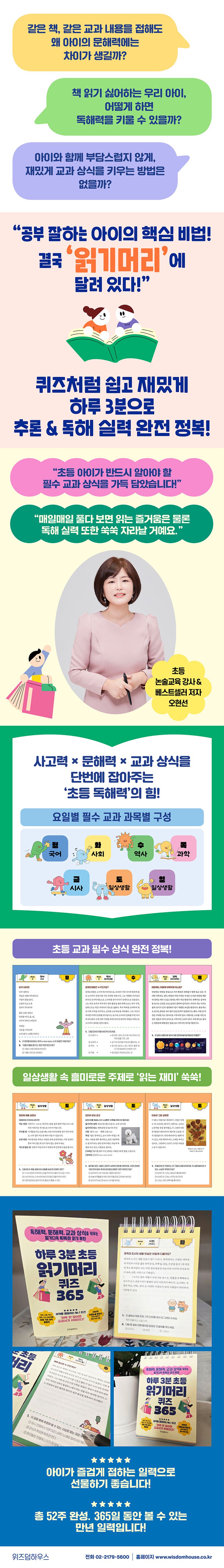 이 책은 하루 한 장 퀴즈 형식으로 구성되어 아이가 흥미를 잃지 않고 꾸준히 읽기 습관을 형성하도록 돕는다. 국어, 사회, 역사, 과학, 시사 등 다양한 교과 기반 지문으로 교과 상식과 사고력 또한 함께 키울 수 있다. 교과 과정을 반영해 '읽기머리' 향상에 집중한 점은 다른 학습 일력과의 차별점이다. 초등 전 학년이 활용할 수 있으며, 하루 3분의 꾸준한 읽기와 풀이가 아이의 학습 태도와 학습력을 자연스럽게 높여줄 것이다.