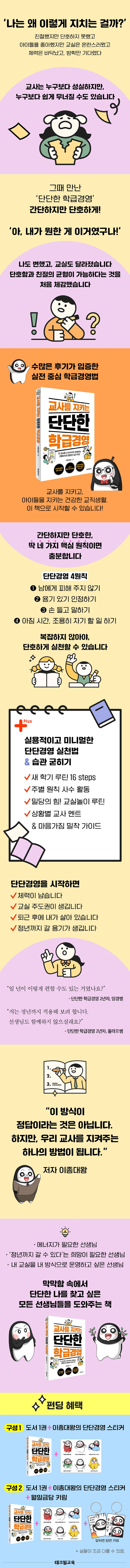 수많은 후기가 효과를 이미 입증한 이종대왕 선생님의 단단한 학급경영을 한 권의 책으로 더욱 깊이 있게 만난다! 교사의 교실 주도권을 확실하게 세워주고 학급을 건강하게 운영하도록 도와주는 ‘단단경영’의 간단하지만 단호한 단 네 가지의 원칙 -‘남에게 피해 주지 않기’, ‘용기 있게 인정하기’, ‘손 들고 말하기’, ‘아침 시간 조용히 자기 할 일 하기’-에 대한 상세 해설과 다양한 상황별 실전 적용 사례를 담았다. 또한 새 학기 루틴 16 steps, 원칙 사수를 위한 주별 활동, 교실놀이 루틴, 구체적 상황별 교사의 대응 멘트 안내까지 모두 수록하여, 교육 현장에서 곧바로 활용할 수 있는 실전 중심의 내용으로 구성되었다. 막막함 속에서 단호함과 친절의 균형을 찾고 싶은 교사, ‘정년까지 간다’는 희망을 다시 품고 싶은 교사에게 확실한 출발점이 되어 주고자 저자가 정성을 다해 집필한 책이다.