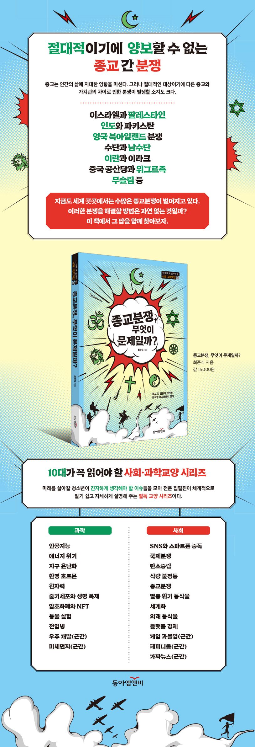 이 책은 전 세계 주요 종교의 개요와 그 종교들 사이에서 일어나는 분쟁의 원인을 짚어보고 그 문제점을 곱씹어보는 계기를 마련해 준다. 또한 우리나라에 뿌리내린 여러 종교 현황과 공존에 대해 자세하고 친절하게 다루고 있다.