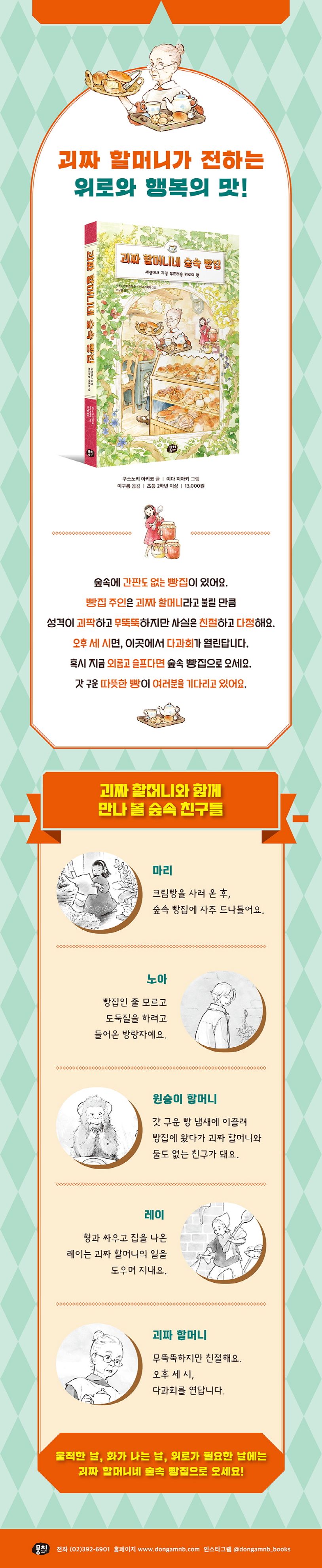 스테디셀러이자 영화로 제작된 『할머니는 괜찮아』로 일본에서 큰 인기를 얻고 있는 작가 구스노키 아키코가 쓴 창작 동화 『괴짜 할머니네 숲속 빵집』이 출간됐습니다. 이 책은 간판도 없는 숲속 빵집을 찾는 여러 손님이 괴짜 할머니가 만든 빵을 맛보며 삶에서 겪는 고통과 상처, 외로움을 치유하는 과정을 섬세하게 그려 낸 작품입니다. 어른과 아이가 함께 읽고 치유 받을 수 있는 힐링 동화입니다.