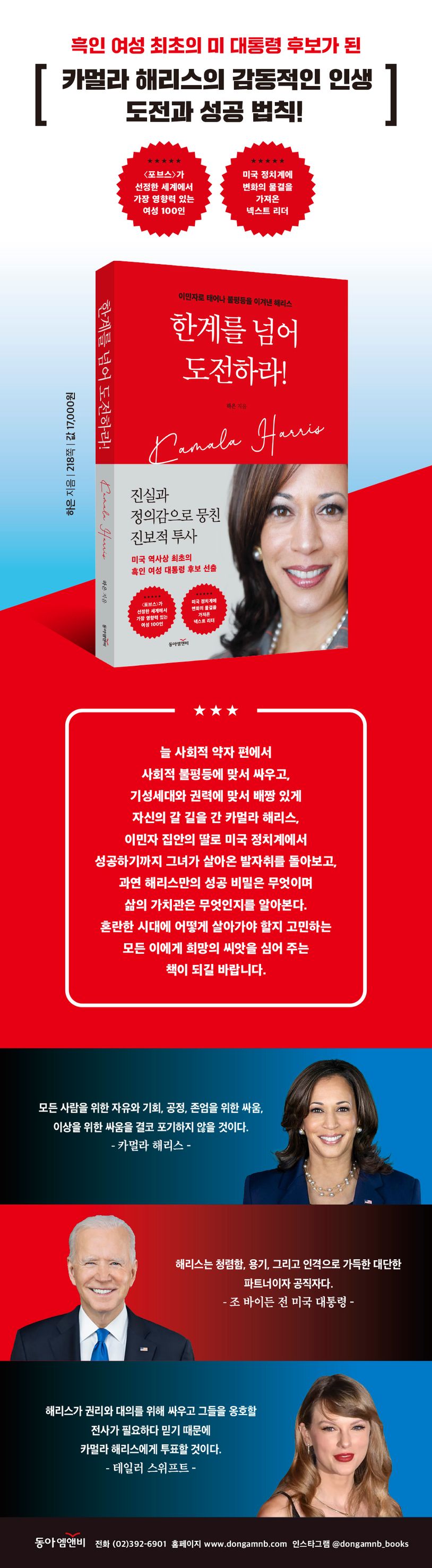 늘 사회적 약자 편에 선 정의로운 법조인으로 사회적 불평등에 맞서 싸우고, 기성세대와 권력에 맞서 우아하지만 배짱 있게 자신의 갈 길을 개척한 카멀라 해리스. 흙수저 이민자 집안의 딸로 미국 정치계에서 성공하기까지 그녀가 살아온 발자취를 돌아보고, 과연 해리스만의 성공 비밀은 무엇이며, 삶의 가치관은 무엇인지 등을 알아본다. 이 시대를 어떻게 살아가야 할지 고민하는 젊은 세대는 물론 기성 세대에게도 희망과 메시지를 전달해 줄 것이다.
