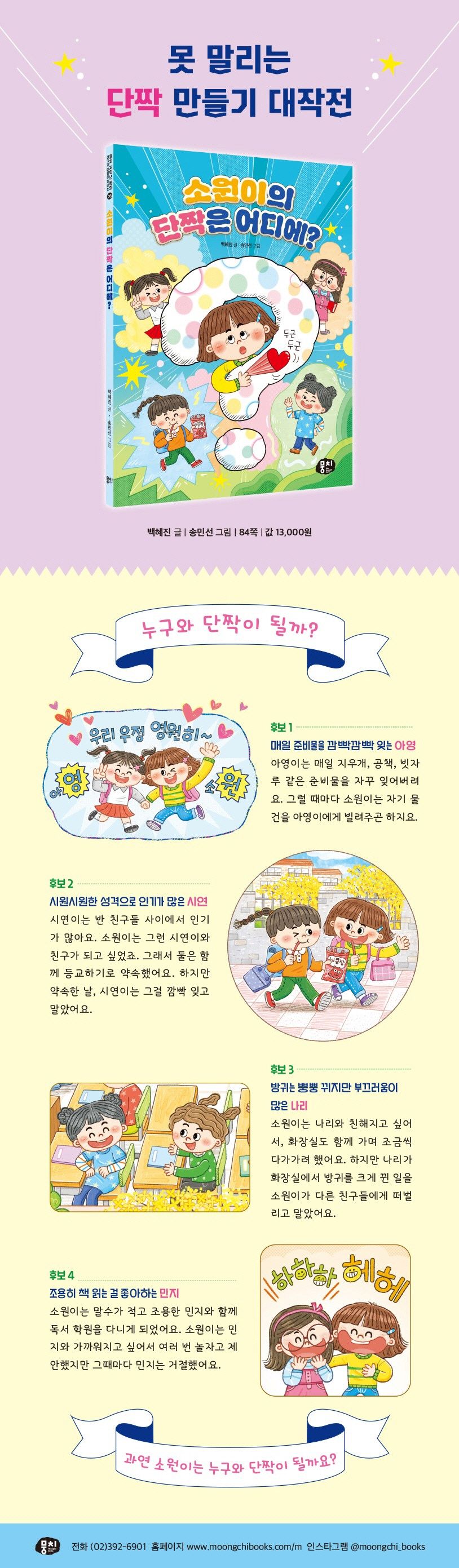 소원이는 마음이 잘 맞는 단짝을 찾아요. 그래서 앞, 옆, 뒤 친구들을 늘 흘끔거리지요. 그때 소원이 앞에 네 친구가 나타나요. 매일 준비물을 깜빡깜빡 잊는 아영, 시원시원한 성격으로 인기가 많은 시연, 방귀는 뿡뿡 뀌지만 부끄러움이 많은 나리, 조용히 책 읽는 걸 좋아하는 민지. 과연 소원이는 누구와 단짝이 될까요?