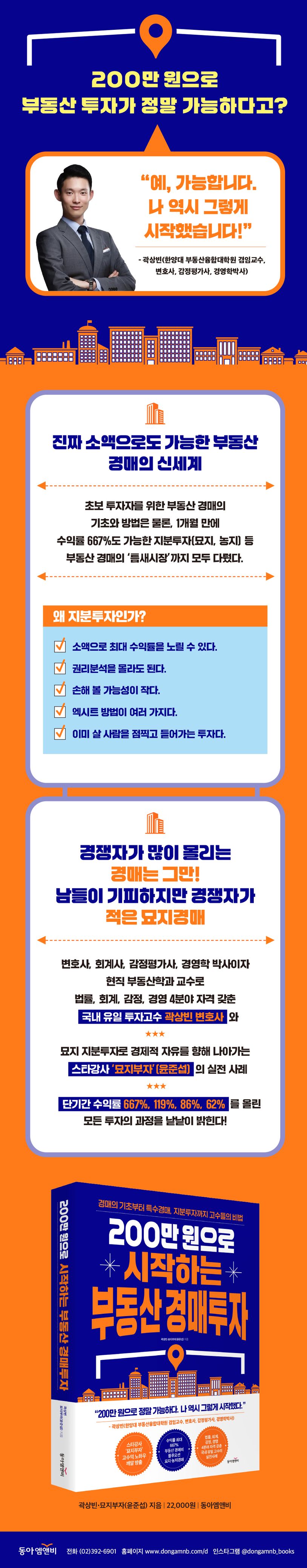 소액으로 단기간 고수익 창출이 가능한 부동산 경매투자의 비법을 다룬 책. 경매 분야에 처음 도전하는 초보 투자자를 위해 부동산 경매의 기초 절차와 방법을 비롯해, 적게는 200만 원부터 시작하는 지분투자까지 모두 다루고 있다.