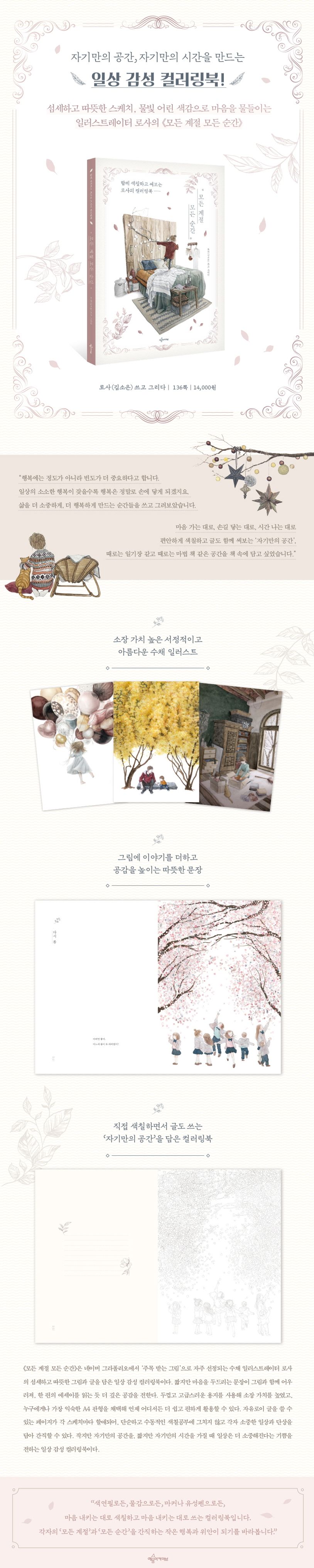 《모든 계절 모든 순간》은 네이버 그라폴리오에서 ‘주목 받는 그림’으로 자주 선정되는 수채 일러스트레이터 로사의 섬세하고 따뜻한 그림과 글을 담은 일상 감성 컬러링북이다. 소중한 이들과 함께하는 4계절 속 일상의 순간들을 포착한 완성본과 섬세한 스케치를 별면으로 수록해, 색연필, 물감, 마커, 유성펜 등 다양한 도구로 색칠하고 그려볼 수 있도록 구성했다. 짧지만 마음을 두드리는 문장이 그림과 함께 어우러져, 한 편의 에세이를 읽는 듯 더 깊은 공감을 전한다. 두껍고 고급스러운 용지를 사용해 소장 가치를 높였고, 누구에게나 가장 익숙한 A4 판형을 채택해 언제 어디서든 더 쉽고 편하게 활용할 수 있다. 어떤 채색 도구를 사용하든 각자의 개성이 드러나도록 스케치 선도 부드럽고 연한 색감으로 반영했다. 색칠뿐만 아니라 자유로이 자기만의 글을 쓸 수 있는 페이지가 각 스케치마다 할애되어, 단순하고 수동적인 색칠공부에 그치지 않고 각자 소중한 일상과 단상을 담아 간직할 수 있다. 작지만 자기만의 공간을, 짧지만 자기만의 시간을 가질 때 일상은 더 소중해진다는 기쁨을 《모든 계절 모든 순간》에서 만나게 될 것이다.