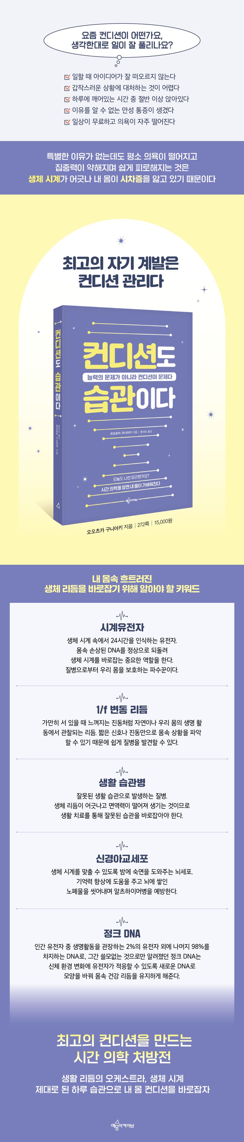 밤낮이 뒤바뀌어 컨디션 조절이 힘들었던 경험을 누구나 한 번쯤 해봤을 것이다. 늦은 밤까지 영화나 책을 보다 아침이 되어서야 잠이 들었을 때, 해외여행으로 장시간 비행한 후 밤낮이 바뀌어 고생해본 적이 있을 것이다. 우리 몸은 왜 밤낮이 바뀌면 힘든 걸까? 모든 게 내 몸의 리듬이 깨졌기 때문이다. 24시간 규칙적으로 흘러가던 몸의 리듬이 깨지면 수면 장애뿐만 아니라 비만이나 당뇨, 위장 장애, 심근경색, 고혈압, 우울증 등 다양한 질병을 유발한다.