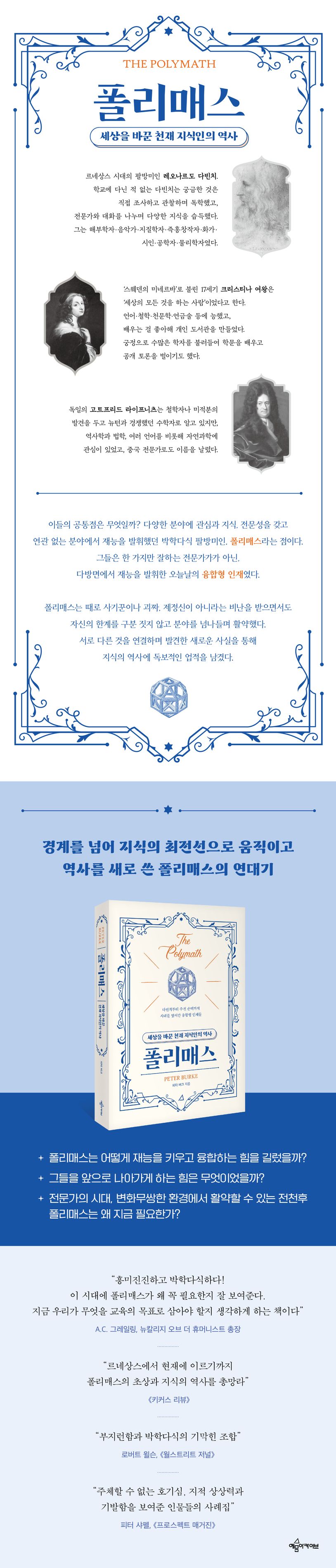폴리매스란 다양한 분야에 관심과 지식, 전문성을 갖고 출중한 재능을 발휘한 사람들을 말한다. 단순히 천재를 의미하는 게 아니라 탐구 정신을 발휘해 서로 관련 없어 보이는 분야의 경계를 넘나들며 활약했던 인재를 가리킨다. 잘 알려진 르네상스 시대의 레오나르도 다빈치, 코메니우스, 17세기의 라이프니츠, 우리와 동시대를 살았던 올리버 색스와 수전 손택 등은 한 가지만 잘하는 전문가가 아닌 자신의 한계를 규정하지 않고 여러 방면에서 재능을 발휘해 시대를 변화시킨 지식인이자 융합형 인재였다.