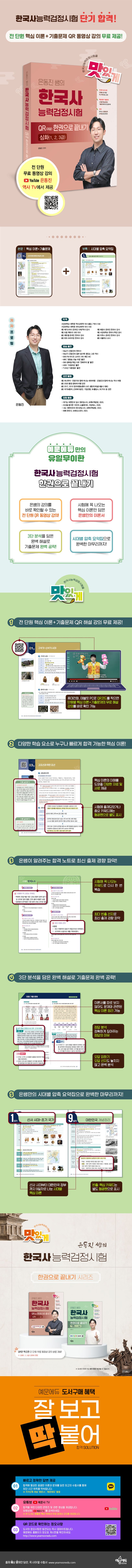 한국사능력검정시험 합격을 위한 ‘은동진 쌤의 한국사능력검정시험 QR(큐알) 한권으로 끝내기[심화]’가 출간되었습니다. 본 도서는 한국사능력검정시험 전 단원 핵심 이론+기출문제에 대한 QR 동영상 강의를 무료로 제공합니다. 또한 부록으로 은쌤의 한국사 시대별 압축 요약집까지 단 한 권에 모두 담아 확실하게 합격할 수 있도록 도와드립니다.