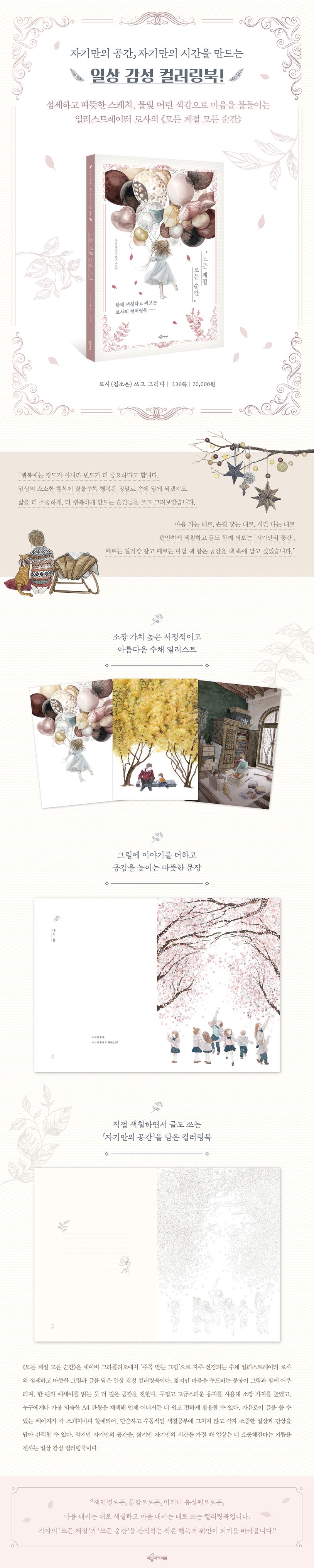 우리일상을더소중하게,더행복하게만드는4계절의순간들을담은일러스트레이터로사의감성컬러링북!소소한일상의행복을직접색칠하고써보며내것으로만드는몰입의기쁨“행복에는정도가아니라빈도가더중요하다고합니다.일상의소소한행복이잦을수록행복은정말로손에닿게되겠지요.삶을더소중하게,더행복하게만드는순간들을쓰고그려보았습니다.마음가는대로,손길닿는대로,시간나는대로편안하게색칠하고글도함께써보는‘자기만의공간’,때로는일기장같고때로는마법책같은공간을책속에담고싶었습니다.”일러스트레이터로사가평범한일상의순간을포착해아름답고서정적인장면으로담아낸수채화들은네이버그라폴리오에서‘주목받는그림’으로자주선정된다.로사의일상감성컬러링북《모든계절모든순간》은소장가치높은원화30점과섬세한스케치를별면으로수록,색연필,물감,마커,유성펜등다양한도구로색칠하고그려보도록구성했다.소중한이들과함께하는4계절속일상의순간들마다짧지만마음을두드리는문장들이어우러져,사연이담긴에세이를읽을때처럼더깊은공감을느낄수있다.두껍고고급스러운용지를사용해그림의소장가치를높였고,익숙한A4판형을채택해누구나언제어디서든더쉽게더편하게활용할수있다.어떤채색도구를사용하든각자의개성을살릴수있도록스케치선도부드럽고연한색감으로마감했다.색칠뿐만아니라자유로이자기만의글을쓰는여백을담은노트페이지가각스케치마다할애되었다.단순하고수동적인색칠공부에그치지않고각자소중한일상과단상을담아간직하는,진정한나만의컬러링북이다.각자색칠해완성한그림들은인테리어용도로도다양하게활용할수있다.‘계절은자연그대로도아름답지만,시간과추억이더해져더소중해진다’는작가로사의편지처럼,작지만자기만의공간을,짧지만자기만의시간을가질때일상은행복에조금씩더가까워진다.《모든계절모든순간》은그소소하고소중한몰입의기쁨을선사하는일상감성컬러링북이다.“색연필로든,물감으로든,마커나유성펜으로든,마음내키는대로색칠하고마음내키는대로쓰는컬러링북입니다.각자의‘모든계절’과‘모든순간’을간직하는작은행복과위안이되기를바라봅니다.”