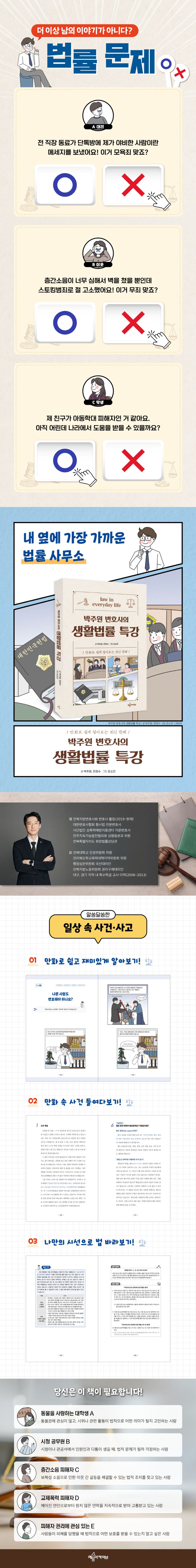 저자:박주원 現전북지방변호사회변호사활동(2019~현재) 대한변호사협회형사법전문변호사 사단법인성폭력예방치료센터자문변호사 전주지속가능발전협의회성평등분과위원 전북특별자치도희망법률상담관 前전북대학교인권위원회위원 전라북도학교폭력대책지역위원회위원 행정심판위원회국선대리인 전북지방노동위원회권리구제대리인 대구,경기지역내특수학급교사이력(2006~2013) 저자:한정수 작업분야|생활법률웹툰기획자 작업소개|무겁고어렵게만느껴지는법률을비전공자의시선으로알기쉽게풀어냈습니다.일상생활속필요한법을쉽고재미있게전하고자법률관련SNS를운영하고있으며,업로드되는콘텐츠를감수하고있습니다. 그림:강소민 작업분야|디지털드로잉,인스타툰 작업소개|2022년부터직장내구성원들과의즐거운일상을웹툰으로그리며,사람들과함께한순간들을따뜻한시선으로담아내고있습니다.일상속에서발견한장면을그림으로기록하고,작은웃음을전하고자합니다.
