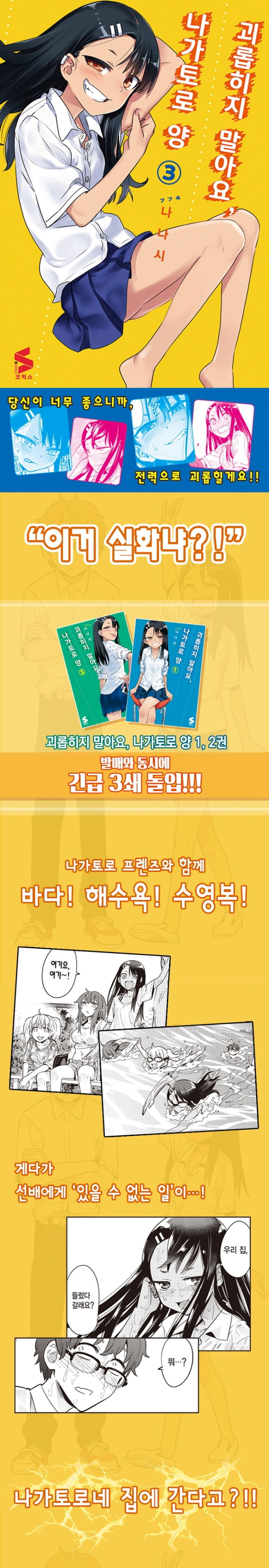 [현지판매부수]-일본현지,누적판매부수45만부기록,2019년1월-일본현지,[괴롭히지말아요,나가토로양]4권발매(2019년2월8일발매)[현지반응]-나가토로의친구들도주인공을괴롭히는맛을들여버린것같습니다나가토로와는다른매력의그녀들도굉장히귀엽고사랑스럽습니다.다음권도빨리보고싶네요.-커플인듯커플이아닌두사람의사랑의(?)줄다리기가정말흥미진진합니다.앞으로의내용은어떻게이어질것인가?!새로그린보너스만화도너무재밌게봤습니다.-그림도점점깔끔해지고나가토로는점점더귀여워졌네요.이제는거의가학적인내용은없고,귀여운아이들의러브코미디같은내용이많아서재밌게읽기엔정말좋았습니다.그래도한번씩튀어나오는나가토로의본능은짜릿하네요!-나가토로와나가토로프렌즈들의수영복모습은정말최고였습니다.다음권도빨리볼수있으면좋겠습니다.