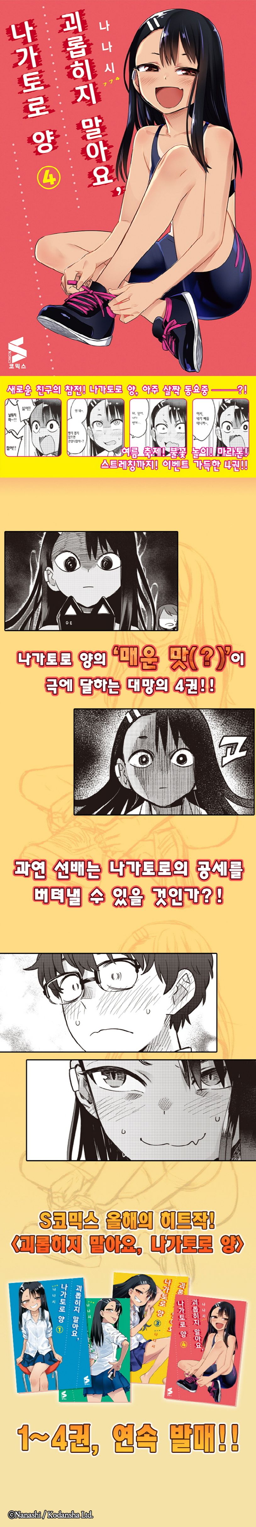 -드디어나가토로의새로운친구등장이네요!!새로운전력이합류한나가토로프렌즈의파괴력으로선배를신나게괴롭힙니다.이번권도사길정말잘했습니다.-4권에서진짜두사람사이에진전이있는것같네요!!친구가늘어나면서생기는이런저런이벤트도볼거리입니다.다음권도기대가됩니다.-이제는나가토로양특유의그림체가완성이된느낌입니다.1권에비해서느낌이아주좋아졌습니다.나가토로특유의표정이정말좋아요두사람의사이가더좋아졌으면좋겠습니다.-나가토로의수영복뿐만아니라,스포츠룩도볼수있는진기한권이었네요.가면갈수록러브코미디인지아닌지구분이안되는이만화에빠져버리고나니,헤어나올길이없네요.앞으로도재밌게볼수있을것같습니다.