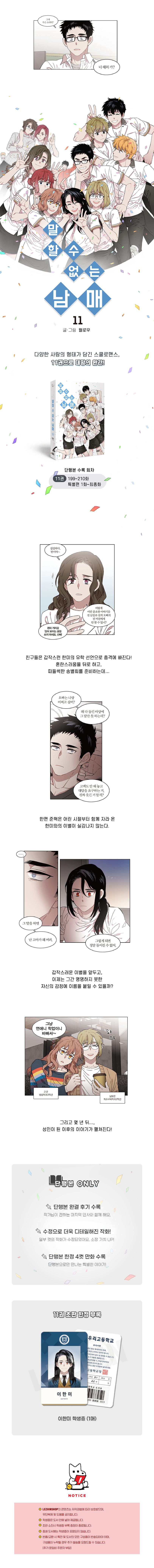 그리고 몇 년 뒤…. 성인이 된 이후의 이야기가 펼쳐진다! 특별 외전까지 알차게 수록한 11권! 단행본에만 수록된 작가의 단행본 완결 후기와 4컷 만화, 그리고 더욱 섬세한 디테일로 수정된 작화가 포함된 《말할 수 없는 남매》 시리즈, 단행본 대망의 완결!