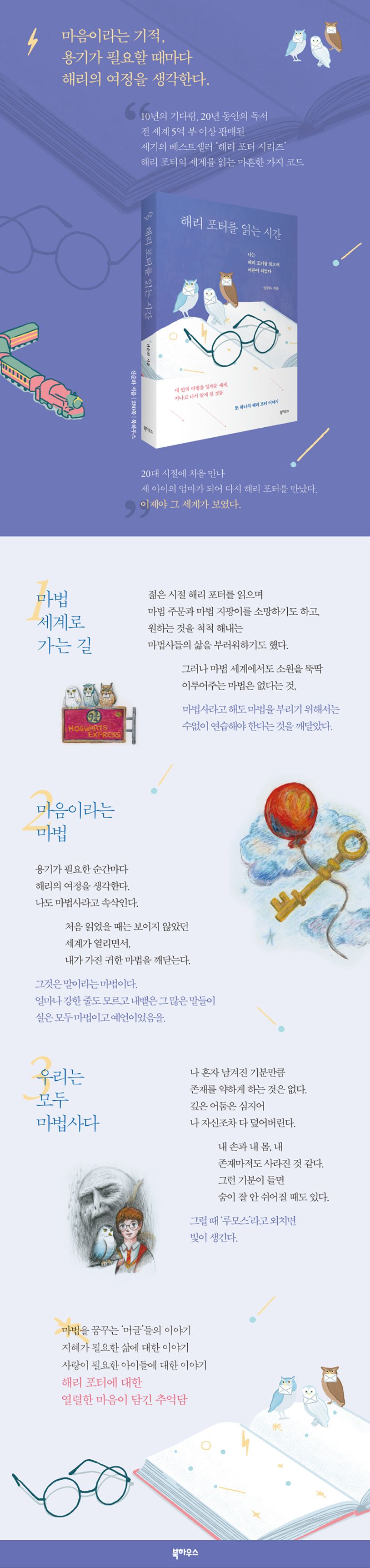 마흔한 편의 글에는 해리 포터의 성장기와 젊은 시절 저자의 소중한 기억이 겹쳐 있다. ‘나는 해리 포터를 읽으며 어른이 되었다’라는 부제처럼 시리즈가 진행되는 사이 해리와 독자들은 함께 자란 셈이다. 더불어 저자는 마법 세계와 현실 세계를 겹쳐내기도 하고 대조해보기도 하면서 삶에 대한 부드러운 성찰을 이끌어낸다.
