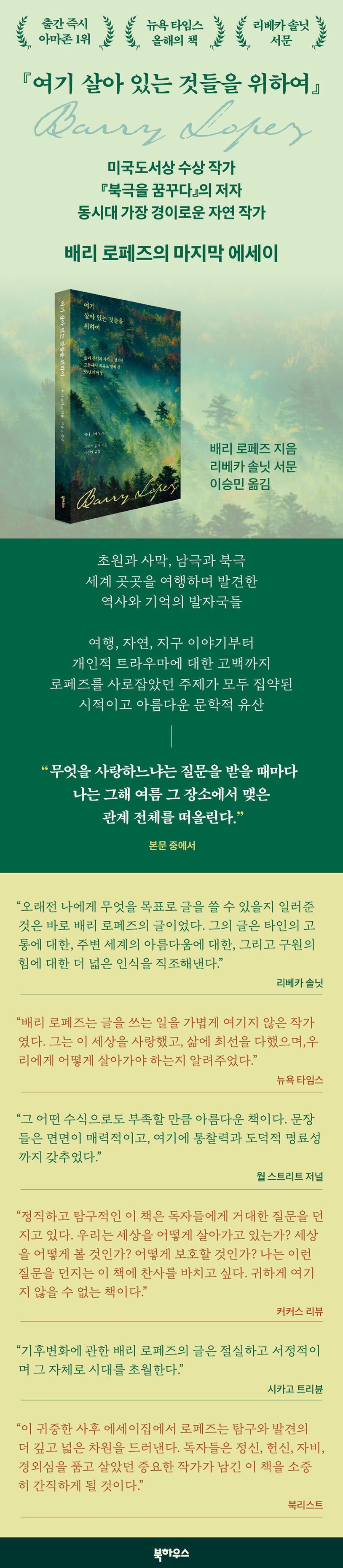 자연과 장소, 인간과 풍경에 대한 탁월한 글쓰기로 “우리 시대의 헨리 데이비드 소로” “우리 시대 최고의 자연 작가” 등의 찬사를 받은 배리 로페즈의 마지막 에세이 모음집 『여기 살아 있는 것들을 위하여』가 출간되었다. 이 책은 로페즈가 자신의 죽음을 예감하며 편집했던 문학적 유산으로, 그가 세상을 떠난 뒤인 2022년에 미국에서 출간되었다. 출간되기 전부터 영어권의 여러 문학잡지에서 기대작으로 손꼽혔으며, 출간 직후에는 온라인 서점 〈아마존〉에서 베스트 1위에 올랐고, 그해 〈뉴욕 타임스〉 최고의 책으로 선정되는 등 큰 관심을 받았다.