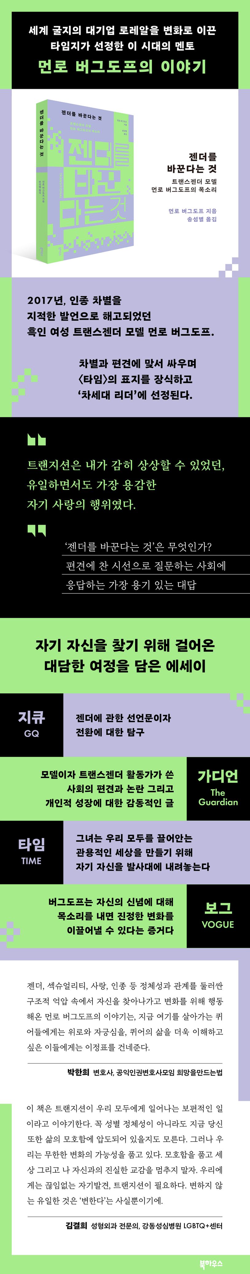 타임지로부터 “차세대 리더, 선구적인 모델이자 활동가”라는 찬사를 받은 흑인 여성 트랜스젠더 모델 먼로 버그도프의 자전적 에세이. ‘트랜지션’에 대한 사회의 편견과 오해를 깨트리고, 트랜지션을 극적인 변화가 아닌 자기 자신의 삶을 되찾아가는 성장의 과정으로 바라볼 수 있게끔 만든다. 영원히 변하지 않는 사람은 없고, 누구나 크고 작은 성장을 통해 변화하듯이 저자는 트랜지션 또한 그런 변화 중 하나임을 설파한다. 이 트랜지션을 자연스러운 변화로 받아들이고 이해한다면, 우리는 혐오와 차별을 해체하고, 인생이라는 이름의 나를 찾아 떠나는 긴 모험을 자유롭게 즐길 수 있을 것이다.