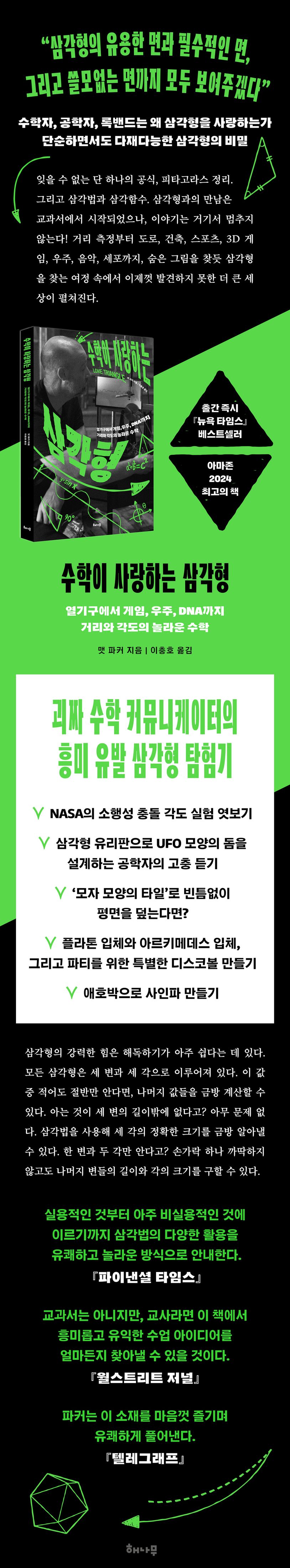 잊을 수 없는 단 하나의 공식, 피타고라스 정리. 삼각형과의 만남은 교과서에서 시작되었으나, 이야기는 거기서 멈추지 않는다! 삼각형의 매력에 빠진 괴짜 수학 커뮤니케이터가 현실 세계에 숨겨진 삼각형을 찾아나섰다.