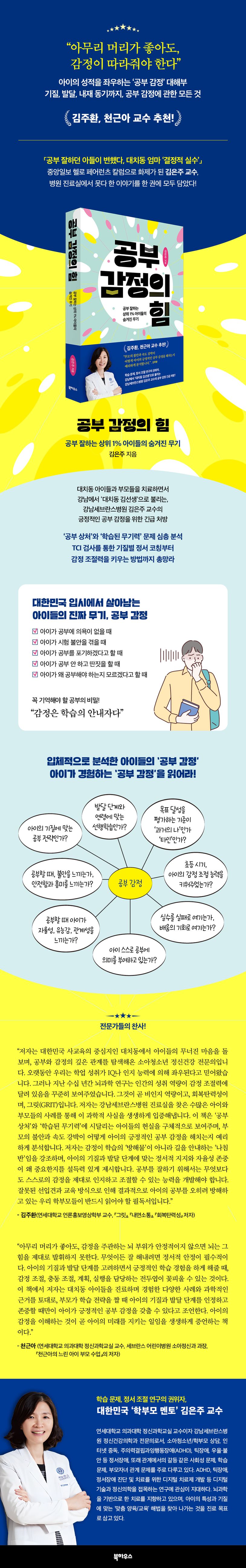 “공부 머리만으로는 안 된다. 아이를 실행으로 이끄는 것은 감정이다.” 김은주 교수의 『공부 감정의 힘』은 아이들의 성적을 좌지우지하는 ‘공부 감정’에 주목한 책이자, 기질에서부터 발달, 내재 동기까지 ‘공부 감정’에 관한 모든 것을 담아놓은 책이다. 저자인 김은주 교수는 학습 문제 및 정서 조절 연구의 권위자로, 강남세브란스병원에서 대치동 아이들의 학습 문제에 대한 치료 경험이 많아 강남 학부모들 사이에서는 ‘대치동 김선생’이라 불리는 정신건강의학과 전문의이다.