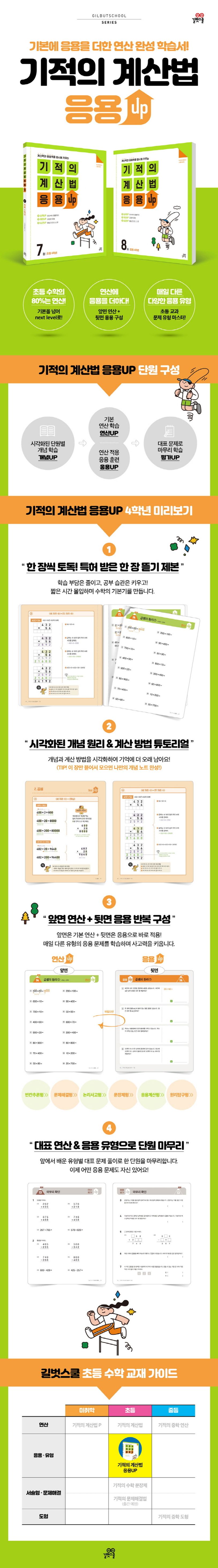 《기적의 계산법 응용UP》은 연산과 응용을 동시에 훈련하고 싶은 학생들을 위한 업그레이드 연산적용 훈련서이다. 한 장에 [앞]연산+[뒤]응용의 문제를 수록하여, 앞에서 연산 반복훈련으로 계산력을 높이고 뒤에서 다양한 유형으로 응용력을 키울 수 있다. 같은 연산을 다양한 유형으로 매일 다르게 반복훈련 하도록 구성하여 지루하지 않은 연산훈련을 한다. 또 앞에서 학습한 연산을 바로바로 응용 유형에 적용하는 훈련을 통해 연산에서 문제해결로 자연스럽게 연결되도록 설계된 사다리 역할을 해주는 교재이다.