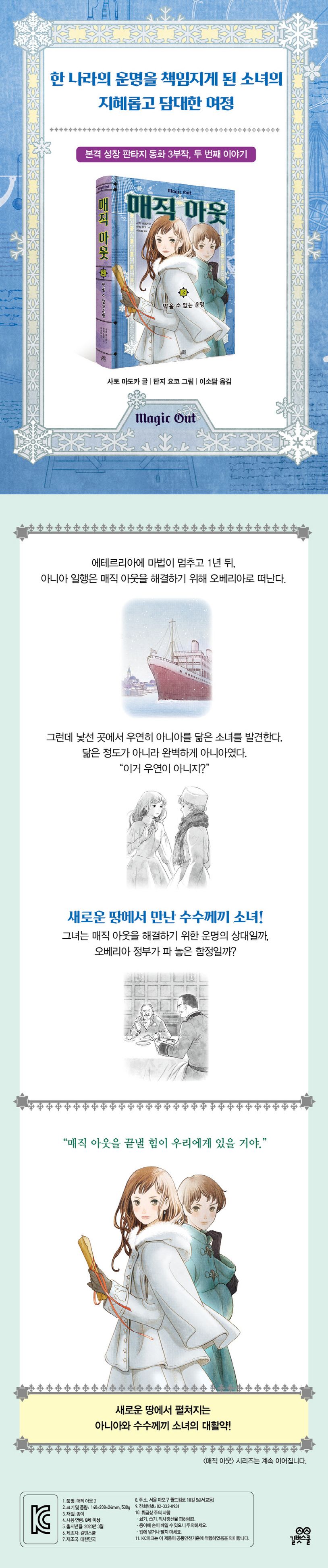 <매직 아웃>은 흥미 위주의 판타지를 넘어서서 독자들에게 묵직한 질문을 던진다. 평등한 사회란 무엇인지, 과학 기술이 인간에게 어떤 영향을 미쳤는지, 인간은 자연과 어떻게 공존하며 살아야 하는지 등 다양한 측면에서 생각할 거리를 안겨 준다. <해리 포터> <나니아 연대기>처럼 긴 호흡으로 이어지는 본격 판타지 동화를 기다려 온 어린이에게 반가운 선물이 되어 줄 것이다.