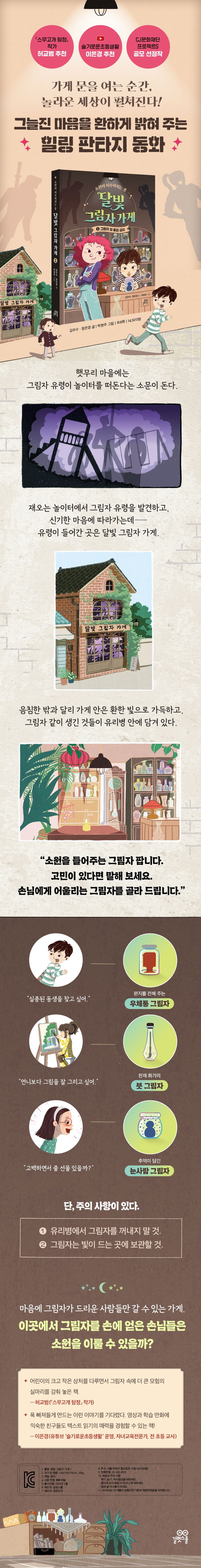 신비로운 가게에서 주인공 재오와 세희가 손님에게 살아 있는 그림자를 팔면서 벌어지는 이야기를 담은 「달빛 그림자 가게」 시리즈의 첫 권이 출간되었다. 검은 늑대 암랑 때문에 그림자 사람으로 변해 버린 빛의 수호자 홍, 청, 록의 이야기와 함께 사라진 동생 재이를 찾기 위한 재오의 고군분투가 시리즈 전반에 걸쳐 흥미진진하게 이어질 예정이다. 책임감 강한 재오, 당당한 세희, 단호한 홍, 덤벙대는 청, 친절한 록까지 개성 강한 다섯 캐릭터는 서로에게 맞춰 나가는 과정을 통해 조금씩 성장한다. 완벽하지 않지만 허술해서 더 유쾌하고 정감 가는 이들의 활약을 기대해도 좋다.