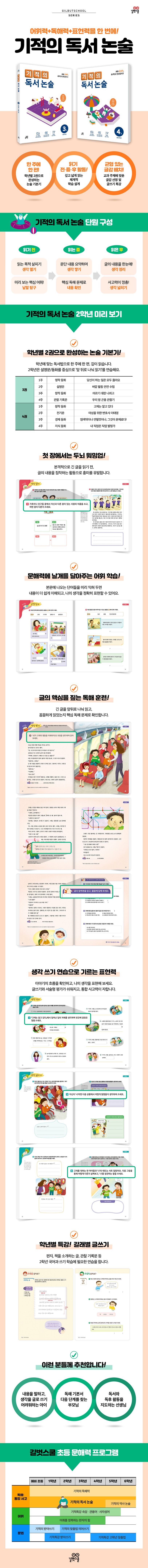 《기적의 독서 논술》은 매주 한 편씩 글을 읽고 생각을 쓰면서 사고력을 키우는 3단계 독서 논술 프로그램이다. 학년별 2권 구성으로, 초등 교과의 독서 단원을 참고해 가정에서도 독서교육을 효율적으로 실천할 수 있도록 설계하였다. 권마다 교과 주제에 맞추어 4편의 글을 실었으며, 한 편을 5일차로 나누어 학습 계획을 세우고 체계적인 독서 논술을 시작할 수 있다. 글을 읽기 전에 생각을 열고, 읽는 중에 내용을 정리하며, 읽은 후 생각을 표현하는 3단계 과정으로 꼼꼼한 책 읽기와 생각 쓰기를 경험한다. 독서 습관이 안 잡혀 있고, 글쓰기가 막막한 초등학생이라면 촘촘하게 설계된 독서 논술 프로그램으로 읽기 습관을 기르고 자기 생각을 표현하는 능력까지 갖출 수 있어 문해력의 기본기를 단단하게 세울 수 있을 것이다.
