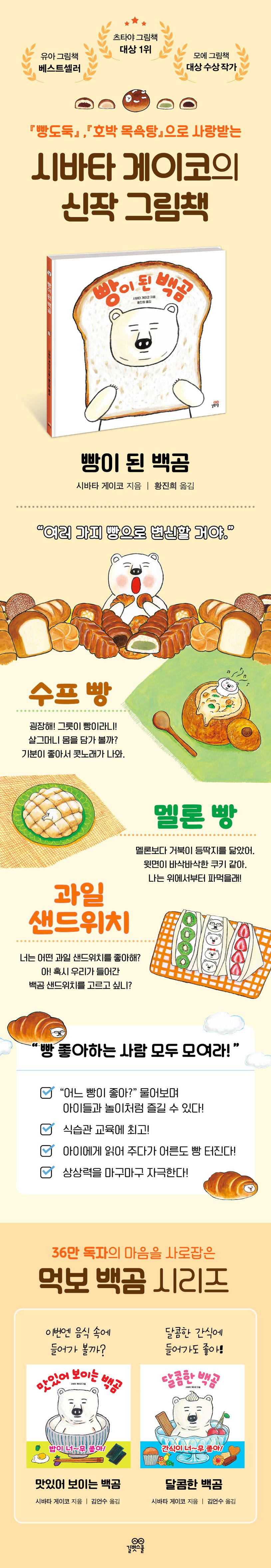 먹는 게 너무 좋아 음식 속에 들어간 먹보 백곰의 유쾌한 상상을 그린 「먹보 백곰」 시리즈 세 번째 책. 전작 『맛있어 보이는 백곰』과 『달콤한 백곰』에서 여러 종류의 밥과 간식에 들어가 본 백곰은 본격적으로 다양한 빵 속에 들어가기로 합니다. 소시지 빵에 소시지 대신 백곰이 쏙! 구름을 닮은 롤빵 속에 백곰이 들어가 하늘로 둥실 두둥실~ 빵이 된 백곰의 변신은 어디까지 이어질까요?