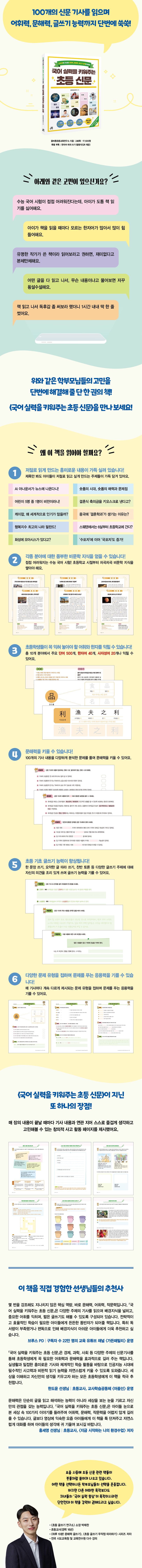 신문 기사는 국내는 물론 세계 각지에서 일어나는 다양한 정보들을 알려주는 중요한 역할을 담당하고 있습니다. 이와 더불어 신문 기사는 그 기사 자체가 기본적으로 많은 어휘, 논리적이고 유기적으로 연결된 문장들로 이루어져 있기 때문에 국어 학습을 할 때에도 중요한 학습 도구로 활용할 수 있는 장점이 있습니다. 이 책은 이러한 신문 기사의 장점을 최대한 살려 효율적으로 국어 학습을 할 수 있는 방향을 제시하고 있습니다. 또한 기존의 초등 문해력 학습서들처럼 딱딱하고 지루한 글을 읽고 문제를 푸는 구성이 아니라 신문 기사의 내용을 바탕으로 어휘력, 문해력, 글쓰기와 관련된 다양한 문제 유형들을 해결하는 과정 속에서 자연스럽게 국어 실력을 키울 수 있도록 구성했습니다.