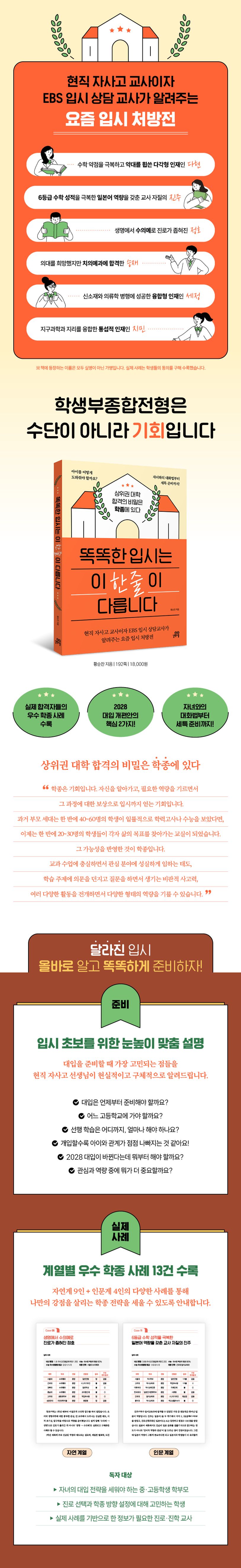 현직 자사고 현직 교사이자 EBS 입시 상담 교사로 활동 중인 저자의 수년간의 상담 경험과 실제 사례를 한 권에 담았습니다. 이 책은 단순히 정보를 나열하는 입시 전략서가 아닙니다. 실제 사례를 중심으로 고등학생이 된 자녀와 어떻게 대화하며, 무엇을 어떻게 도와줘야 할지, 입시가 막막하고 두려운 학부모와 학생이 오늘부터 적용할 수 있는 현장감 있는 솔루션을 제공합니다. 특히 자연계 9인 + 인문계 4인의 사례를 구체적으로 살펴보면서, 나만의 강점을 살리는 학종 전략을 세울 수 있도록 안내합니다.