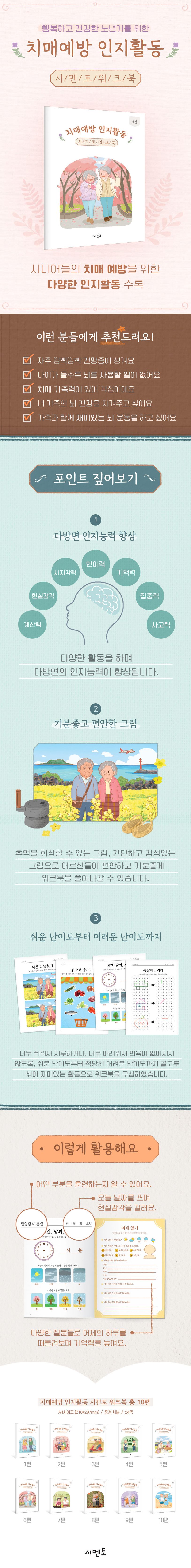 행복하고 건강한 노년기를 위해 시니어들의 치매 예방을 돕는 교재다. 다양한 활동을 통해 기억력, 언어력, 사고력, 현실감각, 시지각력, 계산력, 집중력 등 다방면의 인지능력을 골고루 향상시켜준다. 너무 쉬워서 지루하거나, 너무 어려워서 의욕이 없어지지 않도록 쉬운 난이도부터 적당히 어려운 난이도까지 골고루 섞어 재미있는 활동으로 워크북을 구성하였다.