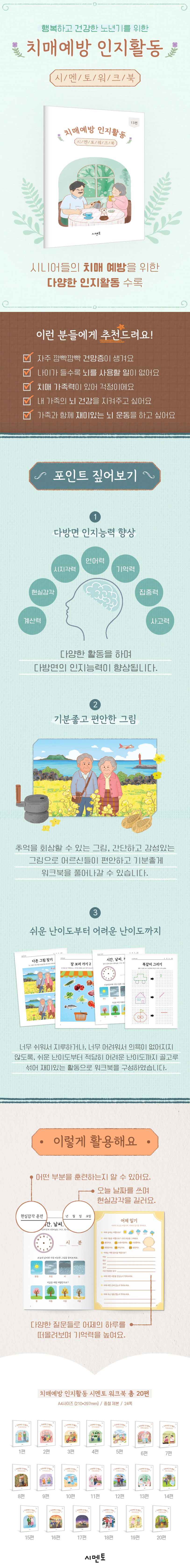 또한 〈치매예방 인지활동 시멘토 워크북〉시리즈는 두툼한 용지와 쫙 펼쳐지는 중철제본으로 만들어져 있으며, 전문가의 감성적인 일러스트를 통해 추억을 회상할 수 있는 그림, 간단하고 감성있는 그림을 넣어 어르신들이 편안하고 기분좋게 워크북을 풀어나갈 수 있게 하였습니다.