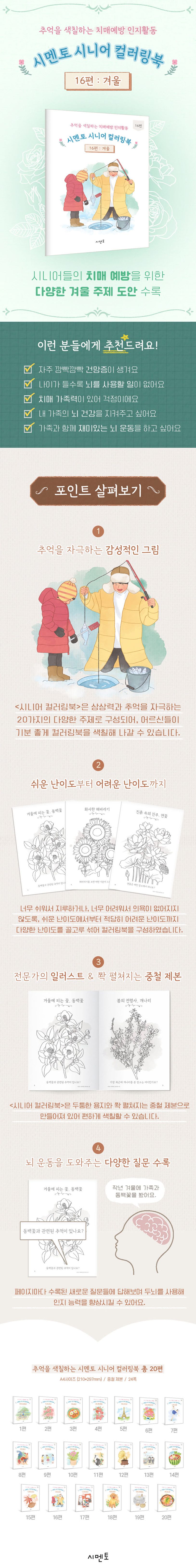 〈추억을 색칠하는 치매예방 인지활동 시멘토 시니어 컬러링북〉시리즈는 상상력과 추억을 자극하는 20가지의 다양한 주제로 구성되어 어르신들이 기분 좋게 컬러링북을 색칠해 나갈 수 있습니다.