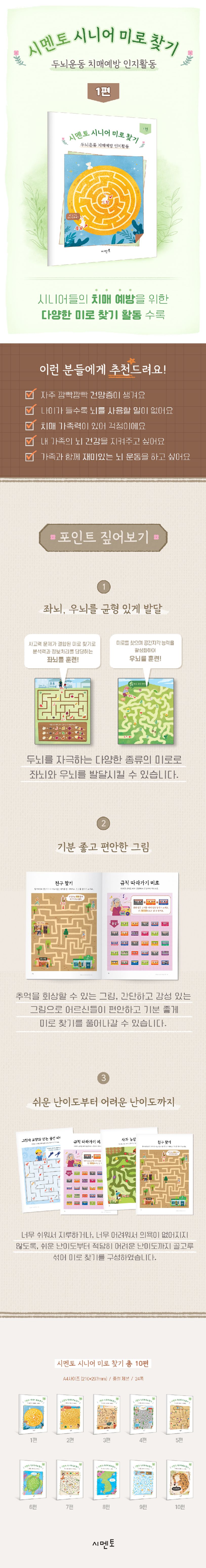 〈시멘토 시니어 미로 찾기 두뇌운동 치매예방 인지활동〉시리즈는 시니어들의 치매 예방을 위한 다양한 미로 찾기를 수록하고 있습니다.