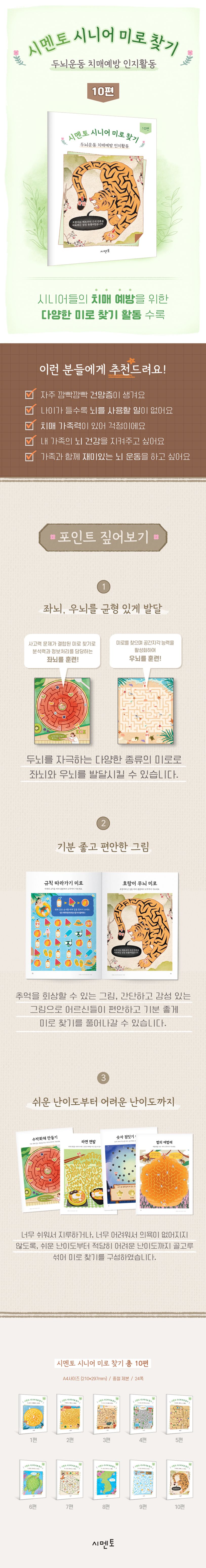 〈시멘토 시니어 미로 찾기 두뇌운동 치매예방 인지활동〉시리즈는 행복하고 건강한 노년기를 위해 시니어들의 치매 예방을 돕는 미로 찾기 워크북입니다.