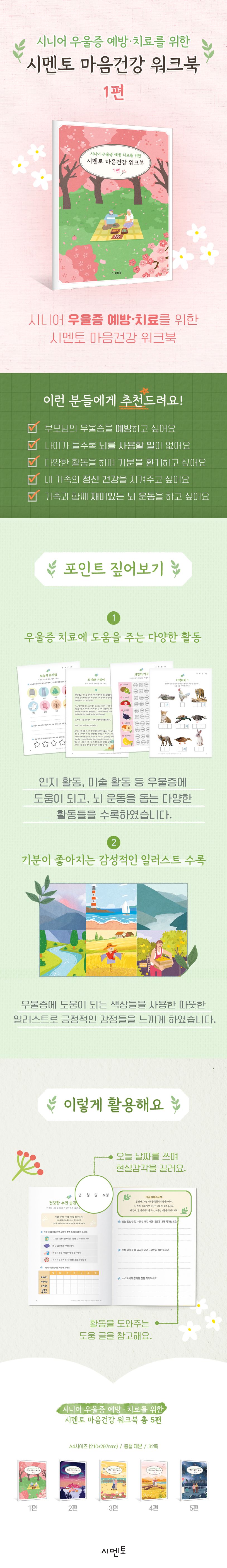 〈시니어 우울증 예방·치료를 위한 시멘토 마음건강 워크북〉시리즈는 행복하고 건강한 노년기를 위해 시니어들의 우울증 예방·치료를 위한 돕는 워크북입니다.