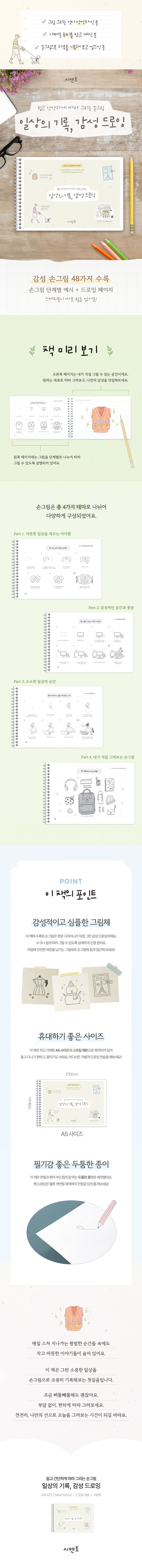 이 책은 왼쪽 페이지에 따라 그리는 순서를 안내하고, 오른쪽 페이지에는 직접 그림을 그려볼 수 있는 공간이 마련되어 있어 일상의 감성을 기록하기에 안성맞춤입니다.