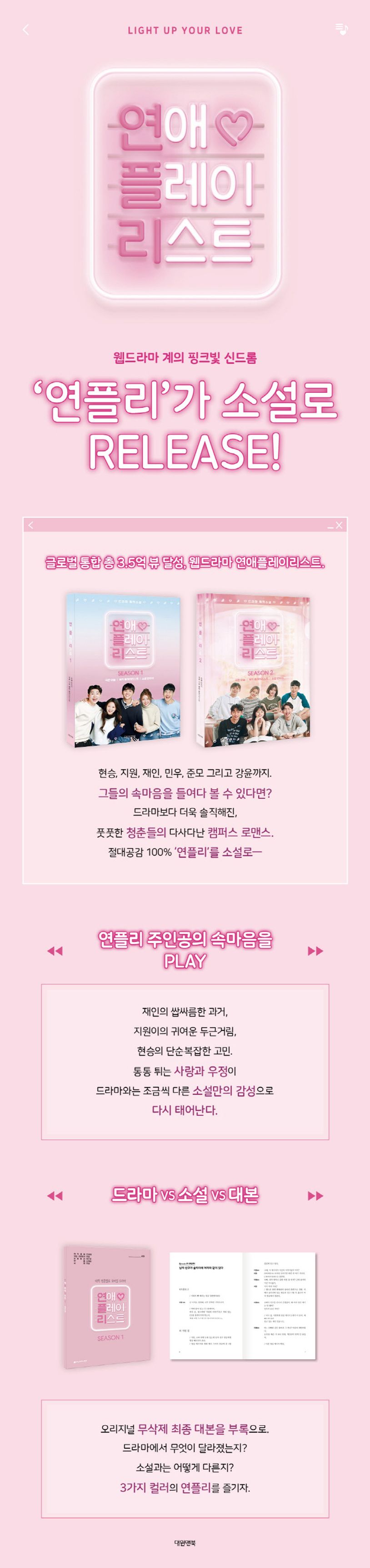 핑크빛 신드롬을 불러일으킨 연애플레이리스트. [연플리]가 소설로 만들어졌다. 풋풋한 청춘들의 다사다난 캠퍼스 로맨스. 5인 5색의 통통 튀는 사랑과 우정이 드라마와는 조금씩 다른 소설만의 촉촉한 감수성으로 다시 태어난다.